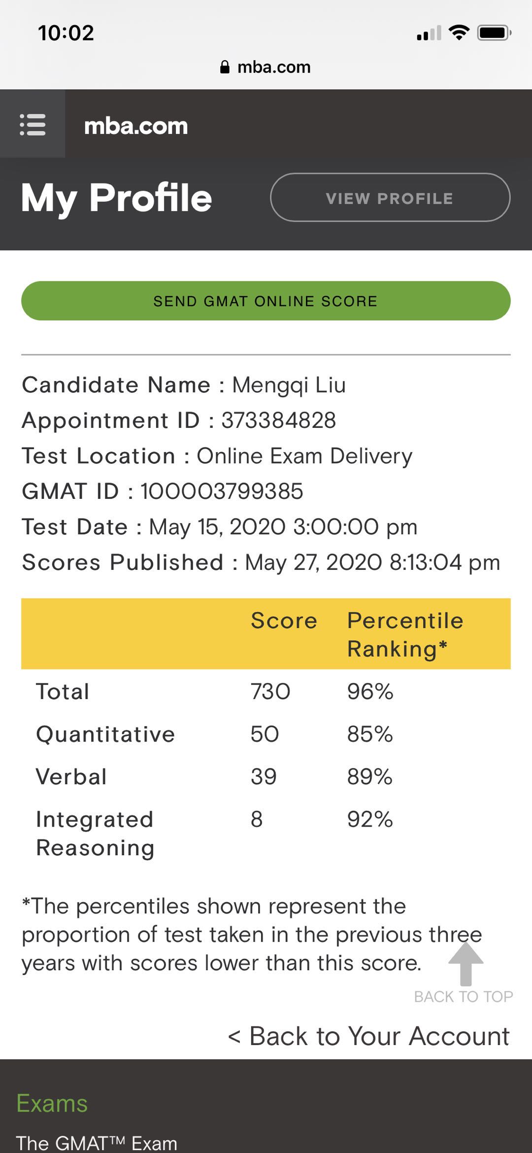 恭喜申友GMAT一对一学员刘同学在国外,报名参加了线上考试,成功出分GMAT 730(Q50+V39),刘同学之前自学考过一次600多,后经过Amanda老师的一对一针对提升,查漏补缺后一次性出分730。