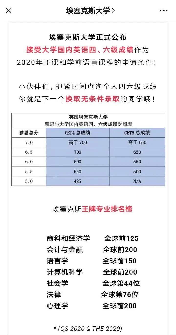 近日,英国埃塞克斯大学在公众号上发布了雅思与国内四六级成绩对照表,并正式公布接受大学国内英语四、六级成绩作为2020年正课和学前语言课程的申请条件!