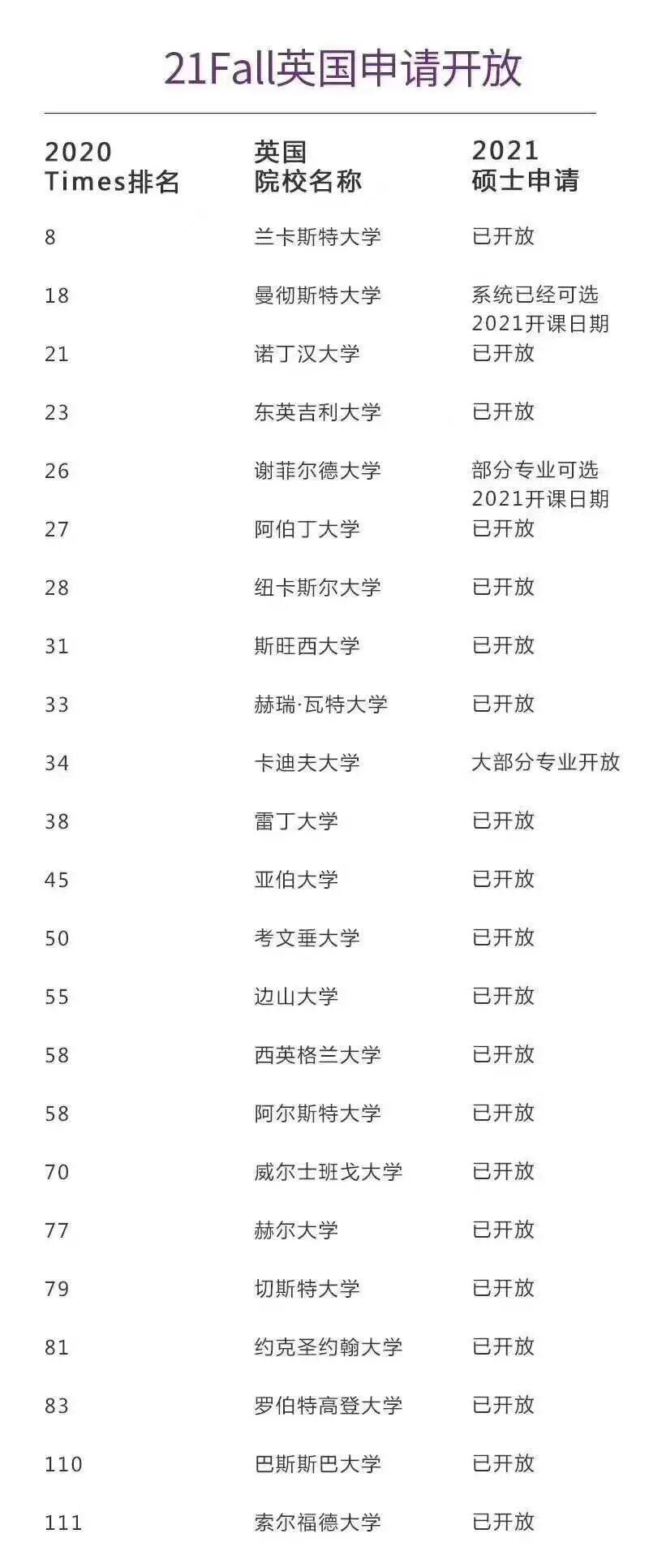 目前,英国部分学校的21Fall申请已经开放了申请通道,相信很多准留学生同学们都非常清楚,英国申请原则就是“先到先得”,学校看到优秀的学生就会录取,一旦招生名额已满便关闭申请通道。